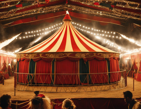 Shimmering lights illuminate a vibrant circus tent. AI