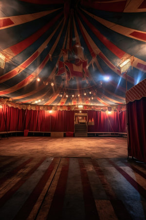 circus tent interior with empty seats and spotlights, created with generative ai