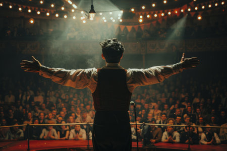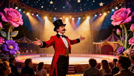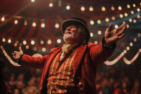 A ringmaster enthusiastically directing the audience attention to the center ring exuding charm and showmanship
