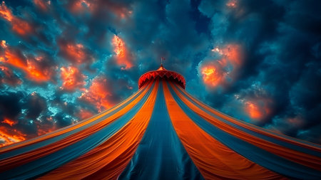 Circus Tent Under a Warn Sunset, Circus Tent Night View, Carnival Park on Red Chaotic Sky Background, Generative AI Illustration