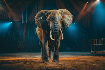 A majestic elephant stands in a circus ring, bathed in colorful lights, captivating the audience with its presence and creating a magical atmosphere filled with excitement.