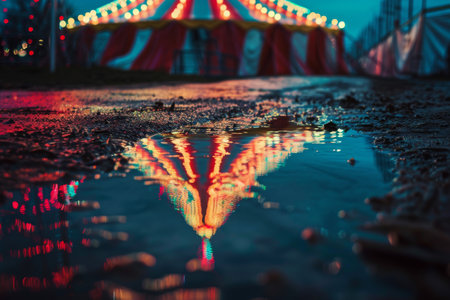 The dazzling lights of the big top tent reflected in a puddle --ar 3:2 Job ID: 473707ac-10f8-4687-9fca-744eefe796b6