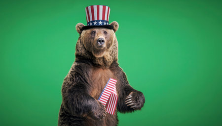 A bear in a patriotic outfit on a green screen.