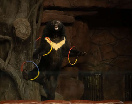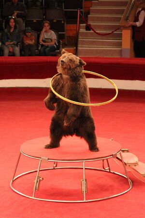 Trained bear twisting hoops in circus arena. Bear cheering audience in circus. Bear showing tricks on circus arena. Trained animal showing number with hoops
