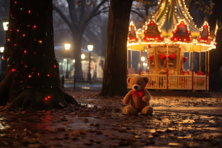 toy bear at the base of a tree, with a carousel in the park softly lit in the background, created with generative ai