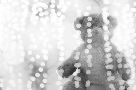 Teddy bear in bed at night with foggy background. Selective focus