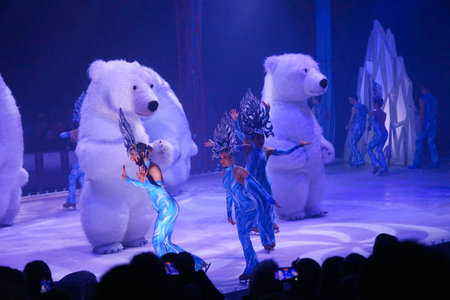 Unique performance with dancers and polar bear costumes at a winter-themed show in a large auditorium