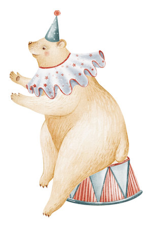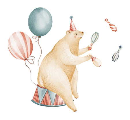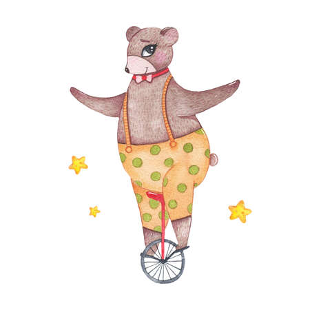 Watercolor circus animal cute bear riding unicycle isolated on white background. Happy birthday party, festive carnival decoration printable nursery for kid textile illustration