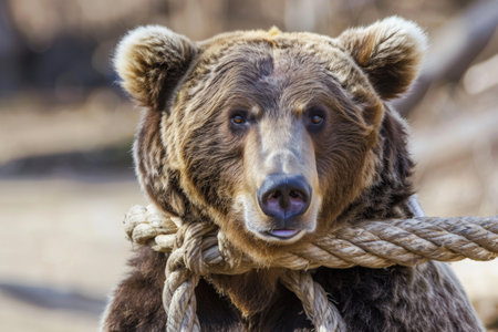 A brown bear has a rope around its neck, showing signs of being entangled or restrained. The bears fur is visible, and the rope appears tight around its neck.