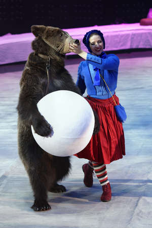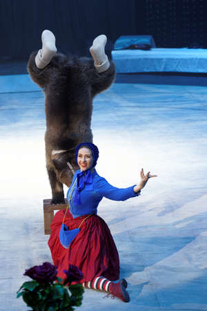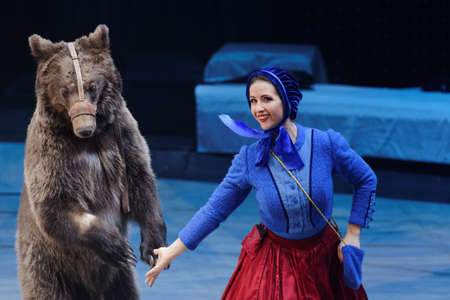 St. Petersburg, Russia - December 28, 2017: Victoria Akimova as Gerda with trained bear in the circus show Snow Queen by Great Moscow circus. The show created by Zapashny brothers circus