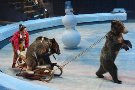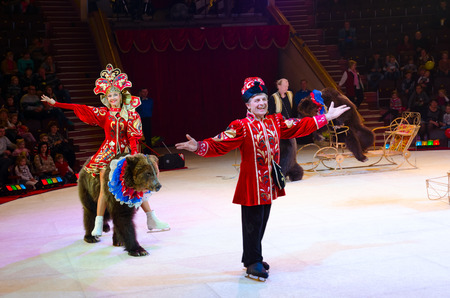 GOMEL, BELARUS - APRIL 10, 2015: Moscow circus on ice on tour. Trained bears under leadership of Natalia and Yuri Alexandrov on arena