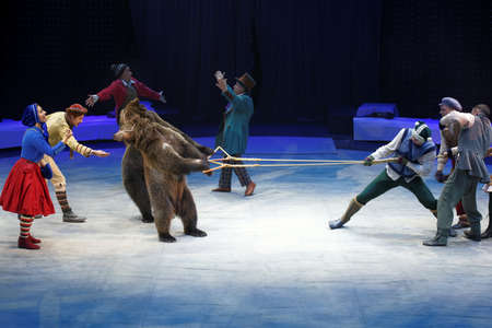 St. Petersburg, Russia - December 28, 2017: Sergey Akimov as Kai with trained bears in the circus show Snow Queen by Great Moscow circus. The show created by Zapashny brothers circus