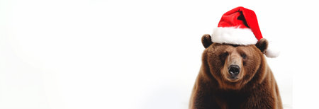 Brown bear wearing a red Santa hat, isolated on white with space for text. Close up portrait of a cute grizzly bear wearing a New Year's Santa hat on a white background.