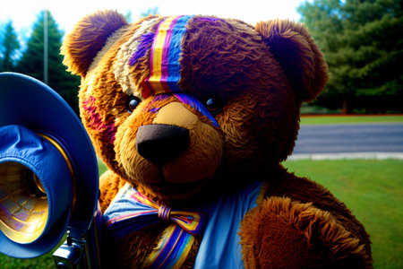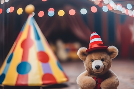 A teddy bear toy on the background of a circus.