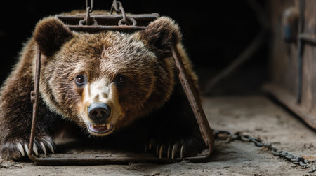 Big upset brown bear in capture of zoo cage looking at camera through metal bars in gloomy day