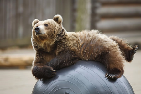 brown bear sitting on a pilates ball in the zoo, close-up