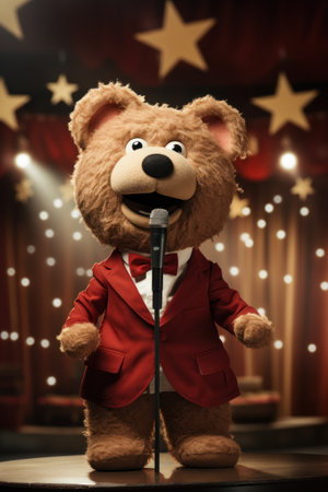 Bear in red suit and bow tie with microphone on stage