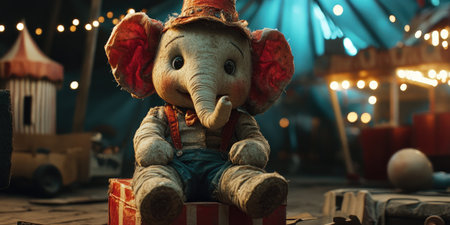 Charming circus elephant plush under big top lights for festival decor and childrens room design