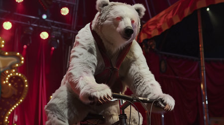 Trained bear driving on bicycle on circus ring. Bear riding bicycle in circus. Amusing bear riding bike around circus arena. Performance with trained bear in circus