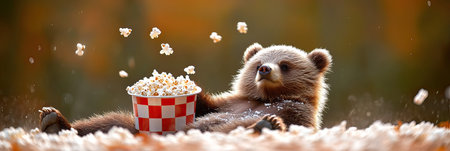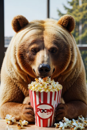 AI Generated. Bear watching old movies with a bowl of popcorn