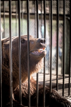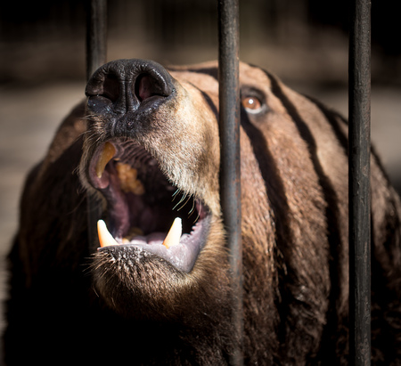 Brown bear sitting in a cage and growls, Krasnoyarsk region, Russia