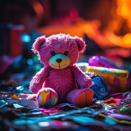 A teddy bear sits on the floor surrounded by other toys, AI