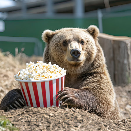 A bear sits comfortably in a natural environment, happily holding a large bowl of popcorn, engaging with its surroundings.