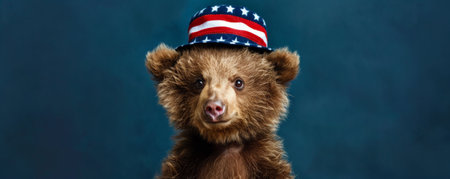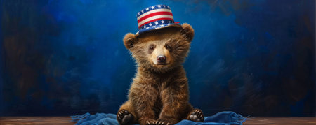 Portrait of a sweet baby bear in a stars and stripes hat on a deep blue background. The bear's fluffy fur and the patriotic hat make for a heartwarming and festive scene.