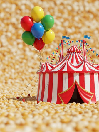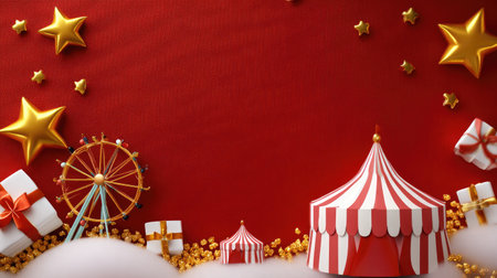 This festive carnival scene features a vibrant red background adorned with a striped tent, golden stars, colorful gifts, and popcorn, perfect for celebrations.