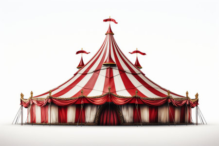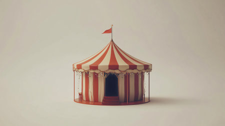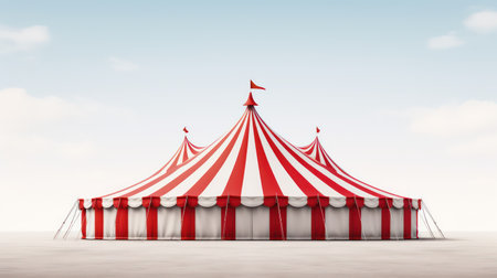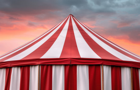 Classic red and white striped circus tent illuminated by a soft light, creating a nostalgic and magical atmosphere