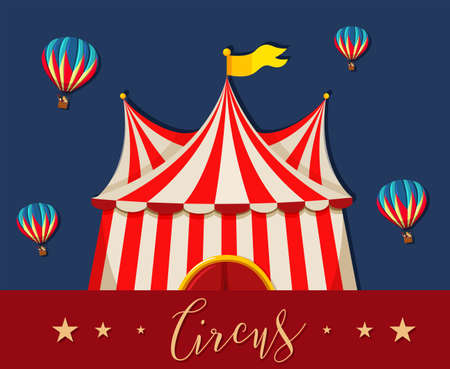 Banner, circus poster. Circus in the illustration. Red stripes, gold. Circus posters. The dome of the circus, colored, bright. Celebration and fun. Entertainment and amusement park. Clowns and acrobat