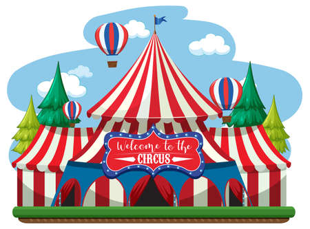 Circus tent with red and white balloons, illustration.