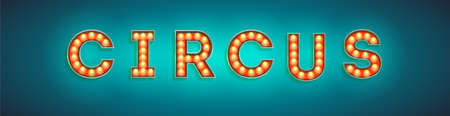 Circus, vintage card. Retro signboard with lighting bulbs. Design of retro fonts with glowing light bulbs. Vector 3d illustration on dark background. Fun fair vector poster