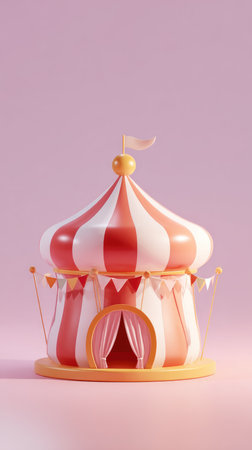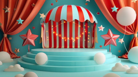 A playful circus stage setup featuring a striped tent and whimsical star decorations, ideal for themes of entertainment, celebration, and childhood nostalgia.