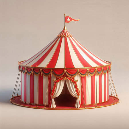 A colorful circus tent with alternating red and white stripes, a small flag with a star, and open curtains inviting visitors to the festive environment.