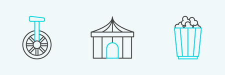 Set line Popcorn in box Unicycle one wheel bicycle and Circus tent icon. Vector.