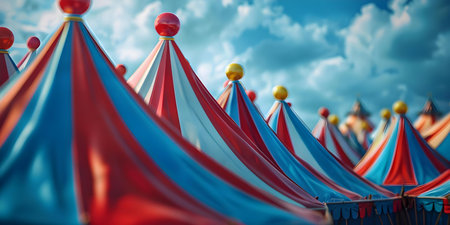 Brightly striped circus tent top with colorful flags fluttering against a blue sky, evoking a festive atmosphere
