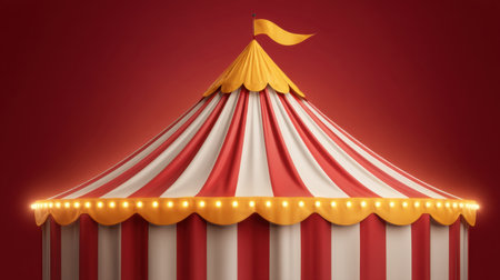 A striking circus tent with bold red and white stripes and warm yellow accents, beautifully lit to create a joyful atmosphere perfect for festive events and celebrations.