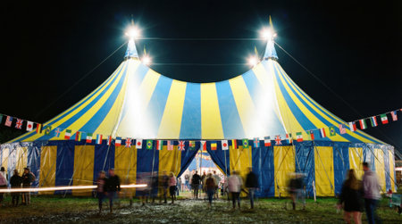 A vibrant yellow and blue striped circus tent glows under bright lights against the dark night sky. Silhouettes of people gather outside the entrance, creating a festive atmosphere.