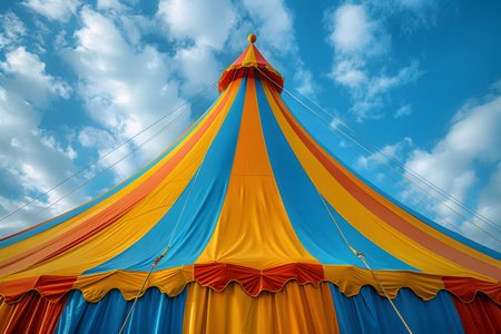 Red and yellow striped circus tent with blue sky