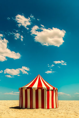 Vibrant red and white striped circus tent under blue sky. Concept Circus Tent, Striped Design, Outdoor Setting, Red and White Colors, Blue Sky