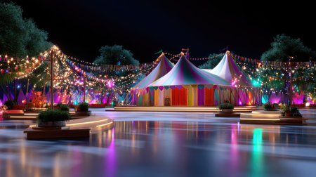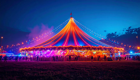This captivating image features a colorful circus tent illuminated by vibrant lights, set against a night sky, creating a magical and festive atmosphere.