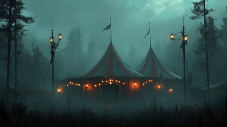 Mysterious circus tent illuminated by lanterns on a foggy night in a secluded forest