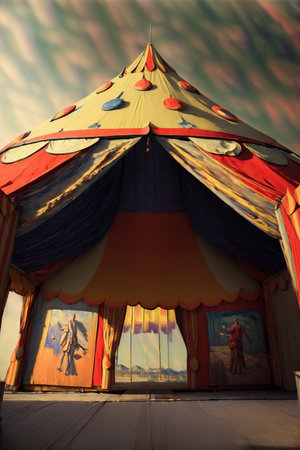 A colorful circus tent with yellow flags stands against a dark, cloudy blue sky. The tent features red, yellow, and blue stripes that converge at the top.