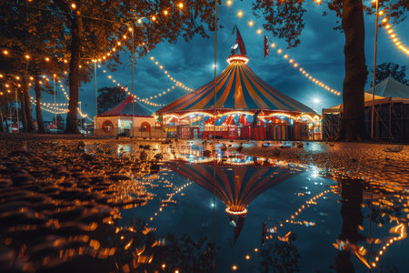 The dazzling lights of the big top tent reflected in a puddle --ar 3:2 Job ID: 79cd4f39-75e0-4e1c-9860-b55b5afbd651