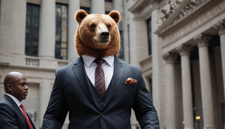 A bear wearing a suit and tie walks past a building with columns, likely on Wall Street. The bears fur is brown, and its face is serious. The bear is in focus, while the building is blurred in the background. The image is likely a metaphor for the financial world, as bears are often associated with market downturns.