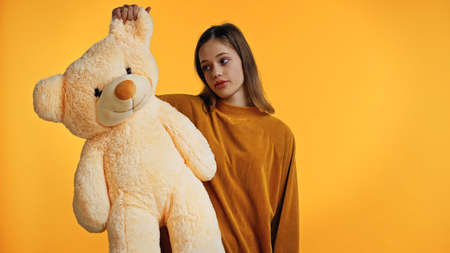 displeased teenager in sweater looking at teddy bear isolated on yellow