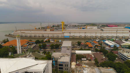 aerial view cargo and passenger seaport with ships and crane Tanjung Perak, surabaya, indonesia. docks for the repair and parking of ships, cargo port and container terminal. ship in industrial port