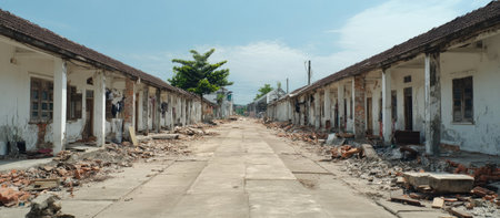 A long row of aged buildings is depicted, with visible signs of deterioration. The structures exhibit damaged walls, broken windows, and debris on the ground. A road leads through the center, illuminated by daylight. The image could be suitable for illustrating themes of urban decay or renovation.