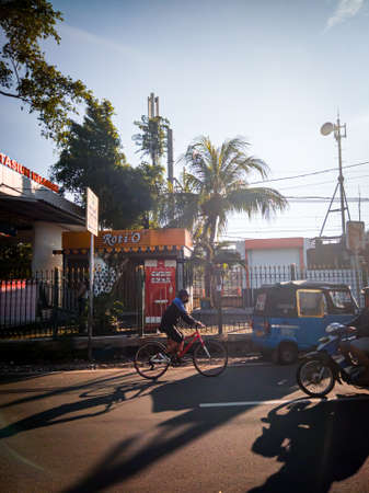 Central Jakarta, Indonesia - March 28th, 2021: Old man cycling on the highway leisurely in the morning.